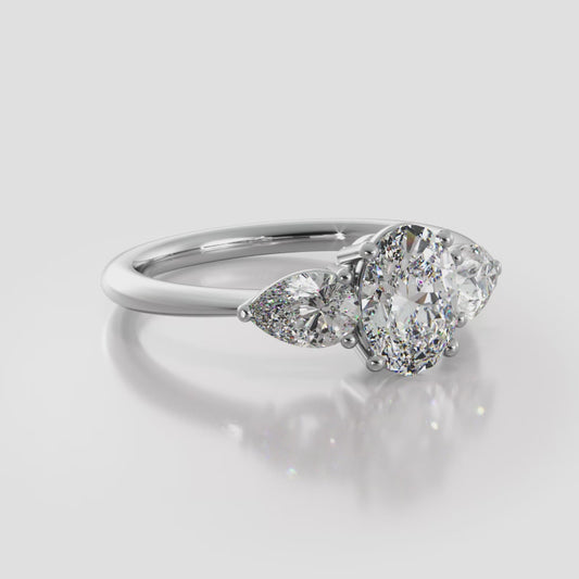 Elegant Three Stone Oval And Pear Diamond Engagement Ring