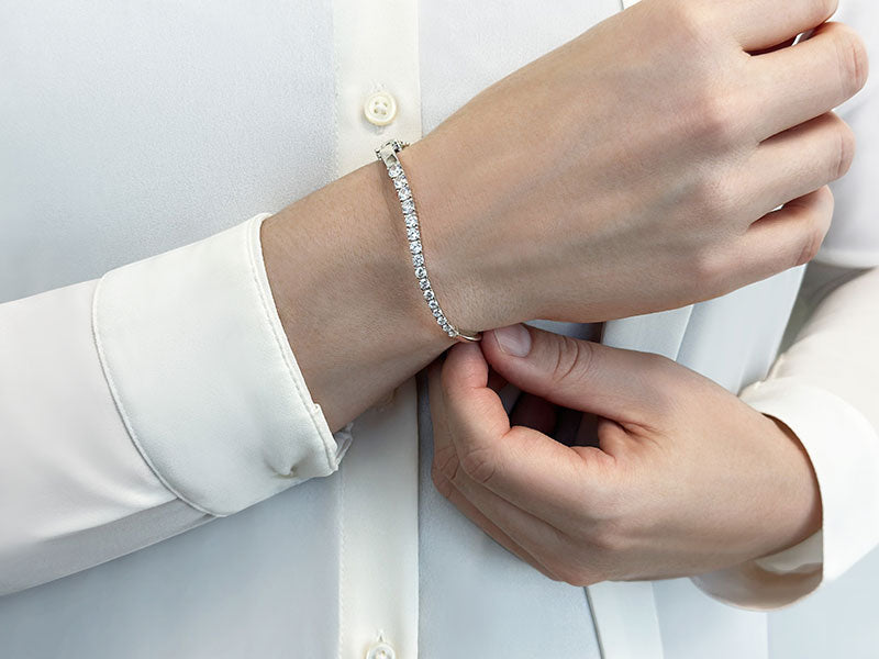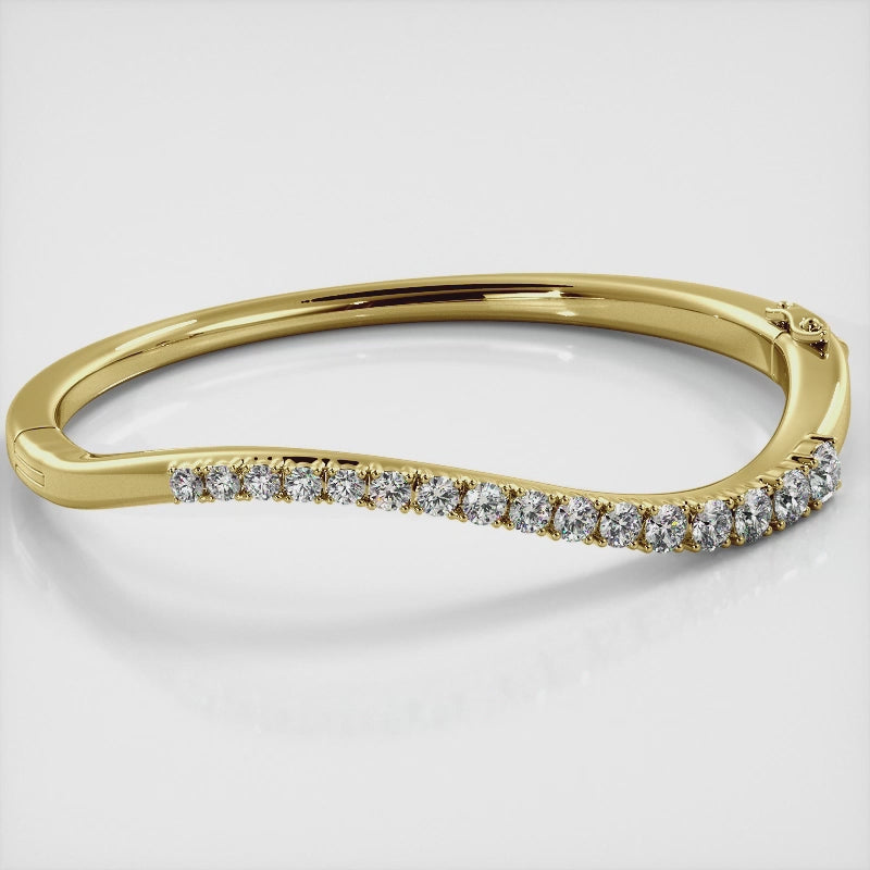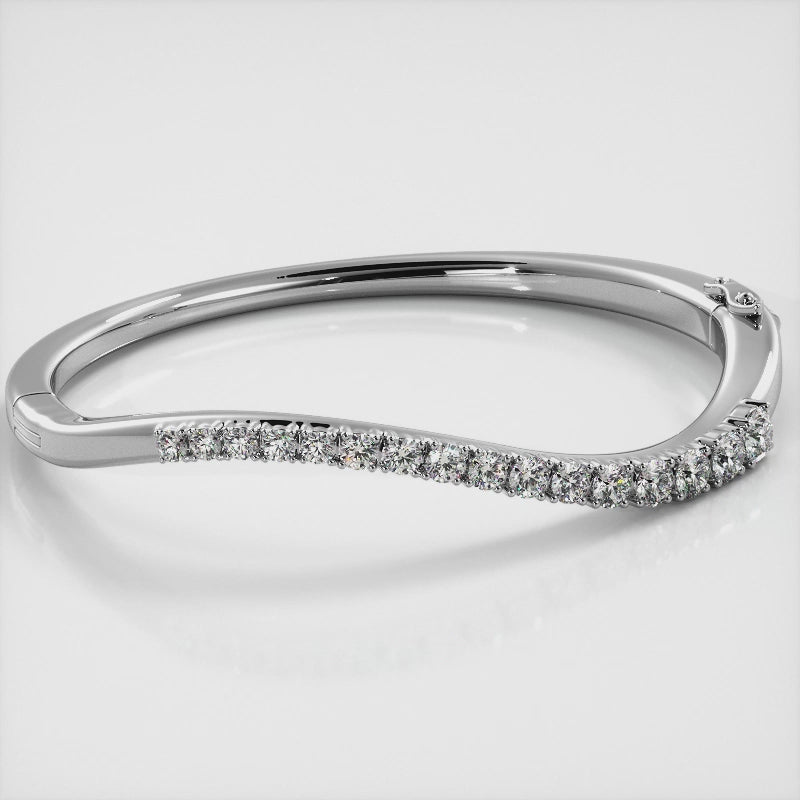 This is one of those incredible pieces that not only looks lovely and will enhance absolutely any outfit, but truly tells a story. What's the story. Well . that's up to you! Perhaps it's the story of your life together, your love, or even a career milestone. No matter what the story, here's the perfect way to say it with a statement! This oval shaped bangle features a smooth gold or platinum bottom. The piece features graduated diamonds, carefully set into the graceful curve along the top of the piece. Go on, tell your story with this one! All our bangles are 7 in length.