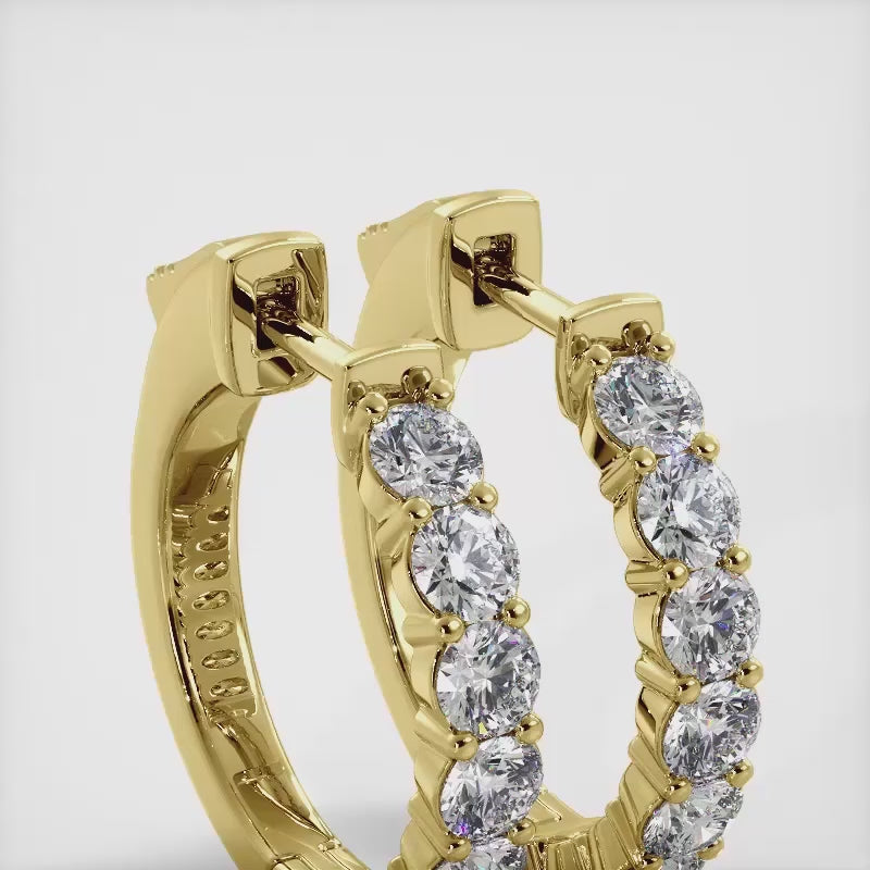 Add a defining sparkling touch to any look with these classic and elegant diamond hoop earrings. Dazzling round diamonds are prong set in perfect alignment to form these beautiful earrings. Our signature push back closure ensures these will be easy to use and secure. Design yours in either 14k or 18k gold or platinum in several available carat weights.