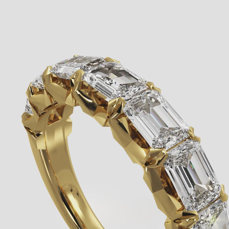 This stunning diamond anniversary ring features emerald cut diamonds along the top of the ring. It is available in various total diamond carat weights for you to choose from.