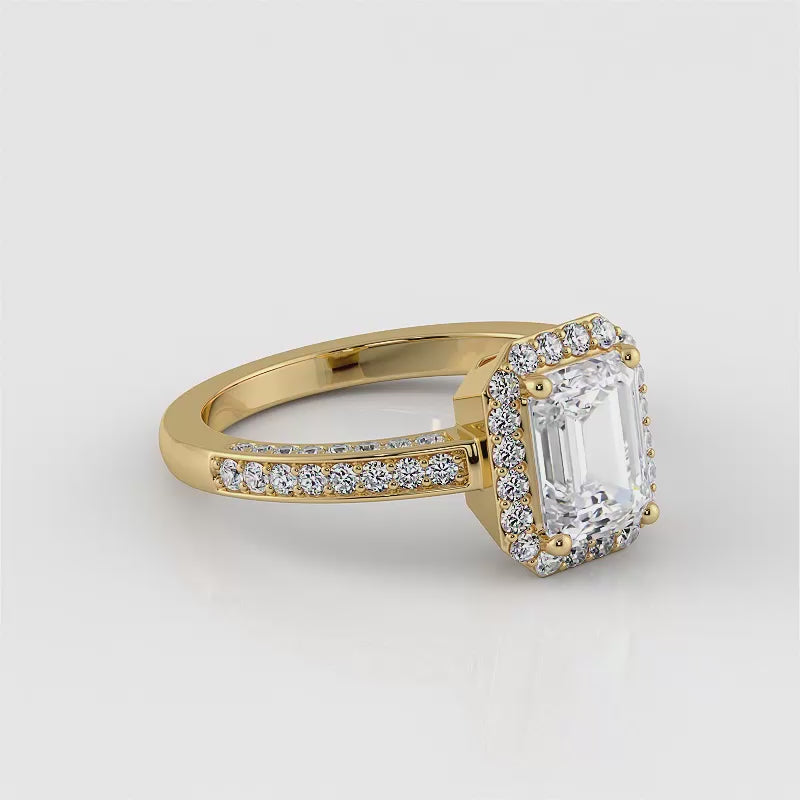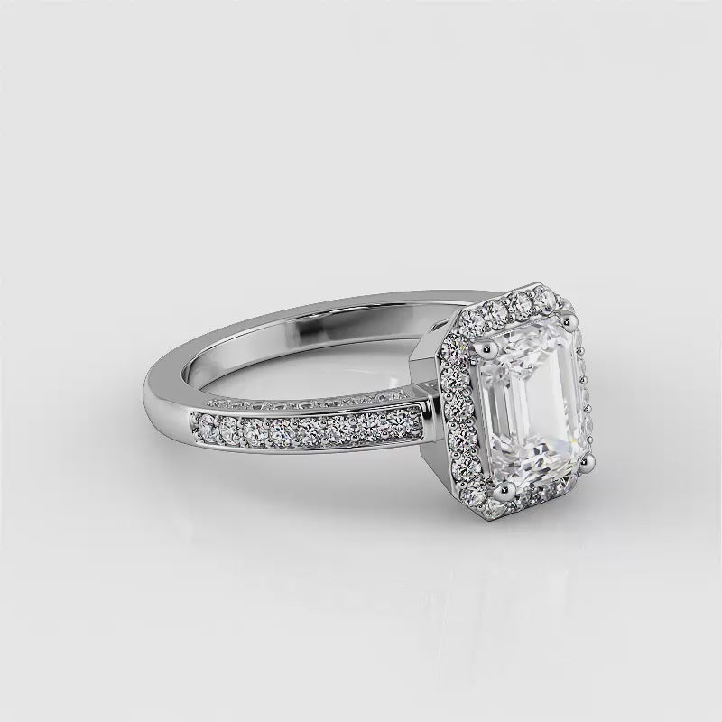 This beautiful diamond engagement ring features an emerald cut diamond in the center. The diamond is surrounded by brilliant cut round diamonds in a halo design. Additional round diamonds are set along the shank of the ring making it sparkle from every angle.
