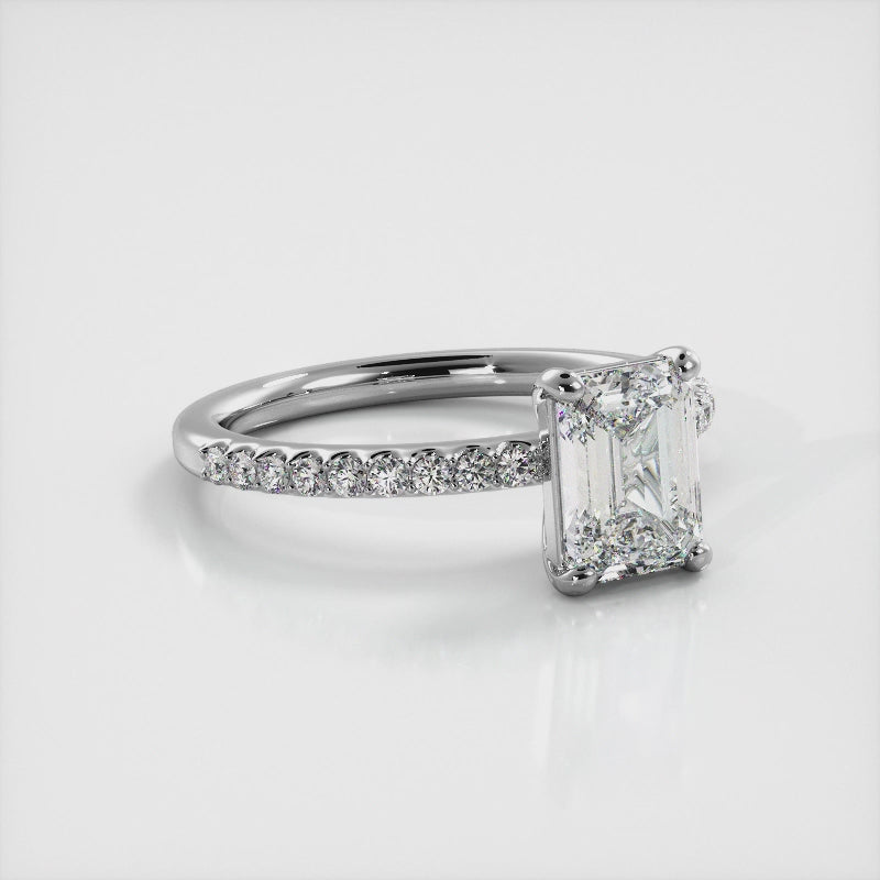 This engagement ring features an emerald center diamond with additional brilliant cut diamonds along the shank of the ring. Each side-diamond is set in a U-Shape cup in a common prong setting. This design feature allows the diamonds to show from the side of the ring.