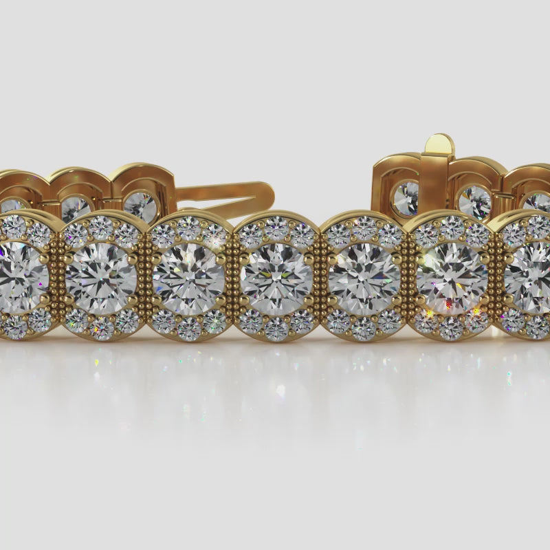 Step into vintage-inspired luxury with the Halo Vintage Diamond Bracelet, a breathtaking piece crafted to captivate and shine. Featuring round diamonds encircled by brilliant-cut diamonds, this exquisite bracelet forms elegant oval-shaped links, radiating brilliance from every angle.