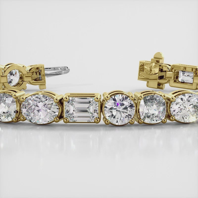 This beautiful tennis bracelet features a unique combination of diamond shapes. The bracelet's diamonds alternate between emerald-cut, oval, cushion, and round diamonds.