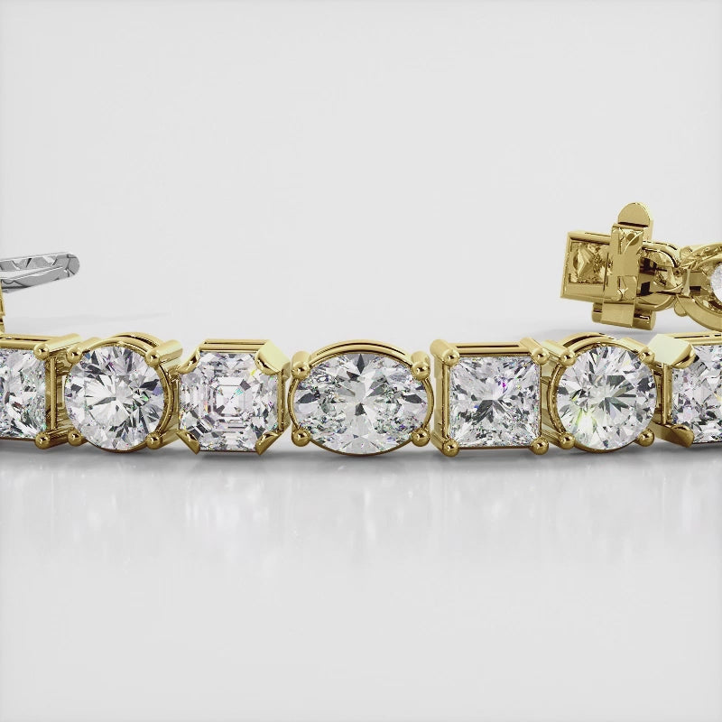 This beautiful tennis bracelet features multiple diamond shapes. The bracelet's diamonds alternate between oval, Asscher, round, and princess