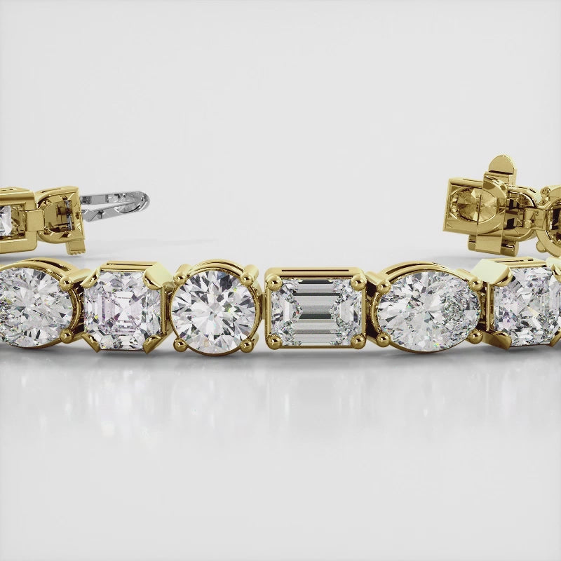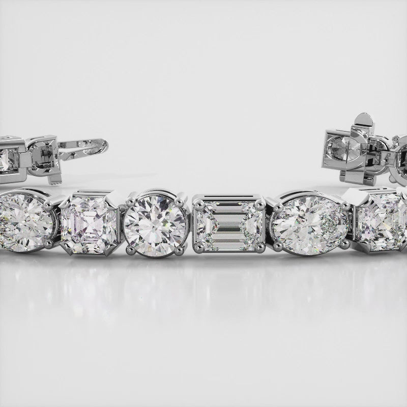 This stunning tennis bracelet features various diamond shapes. The bracelet's diamonds interchange between round, Asscher, oval, and emerald-cut and are arranged in a continuous line.