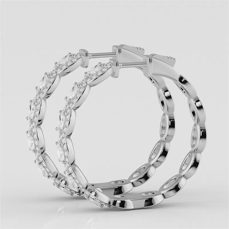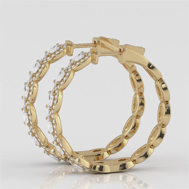 These unique diamond hoop earrings feature oval shaped diamonds, surrounded by brilliant cut round diamonds. The effect is spectacular and make the earrings sparkle from every angle.