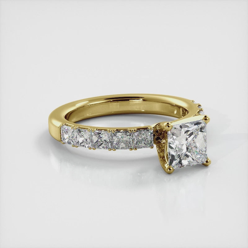 This stunning diamond engagement ring with side stones features lovely princess cut diamonds. There are 10 2.5mm diamonds set along the top portion leading to a prominent princess cut center diamond.
