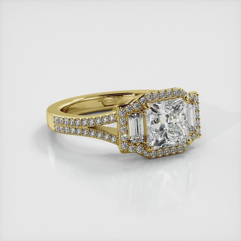 This stunning diamond engagement ring features a three stone design of a princess cut diamond in the center, one baguette diamond on each side, surrounded by brilliant cut round diamonds. The ring has a split shank design with additional diamonds.
