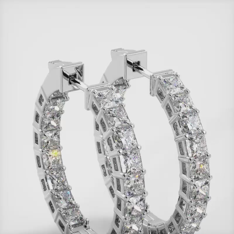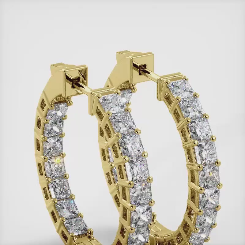These stunning in-out diamond hoop earrings feature princess cut diamonds on both the front and back of the earrings all facing forward.