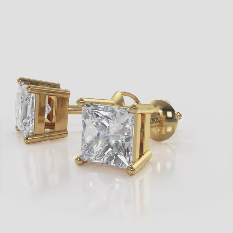 This gorgeous pair of classic princess cut diamond stud earrings is the perfect accessory. These studs earrings come with screw-backs. Featuring a secure four prong design, you can wear these luminous earrings with any outfit.