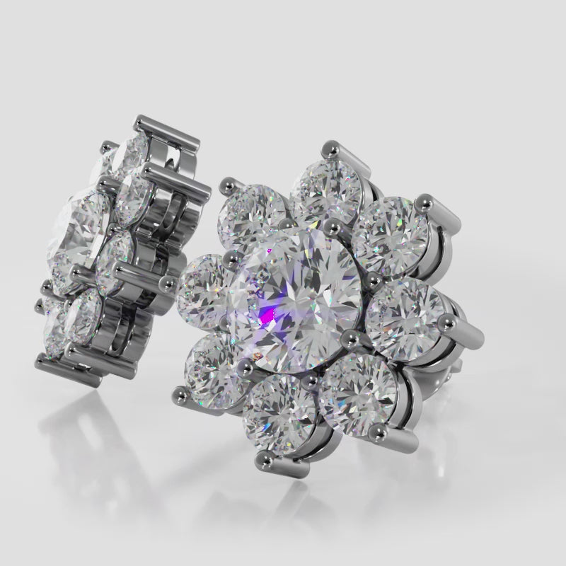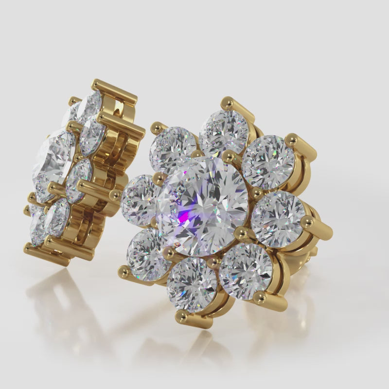 Elevate your jewelry collection with our exquisite stud earrings, featuring a stunning centerpiece diamond surrounded by a halo of smaller round diamonds.