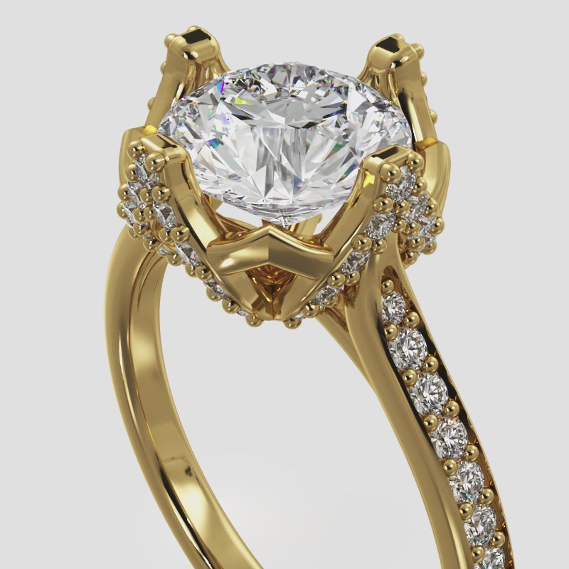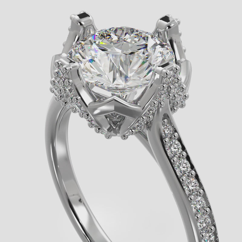 This beautiful diamond ring features brilliant cut round diamonds on the side of the ring and on the crown prong setting that are holding the center diamond. The ring sparkles from all angles.