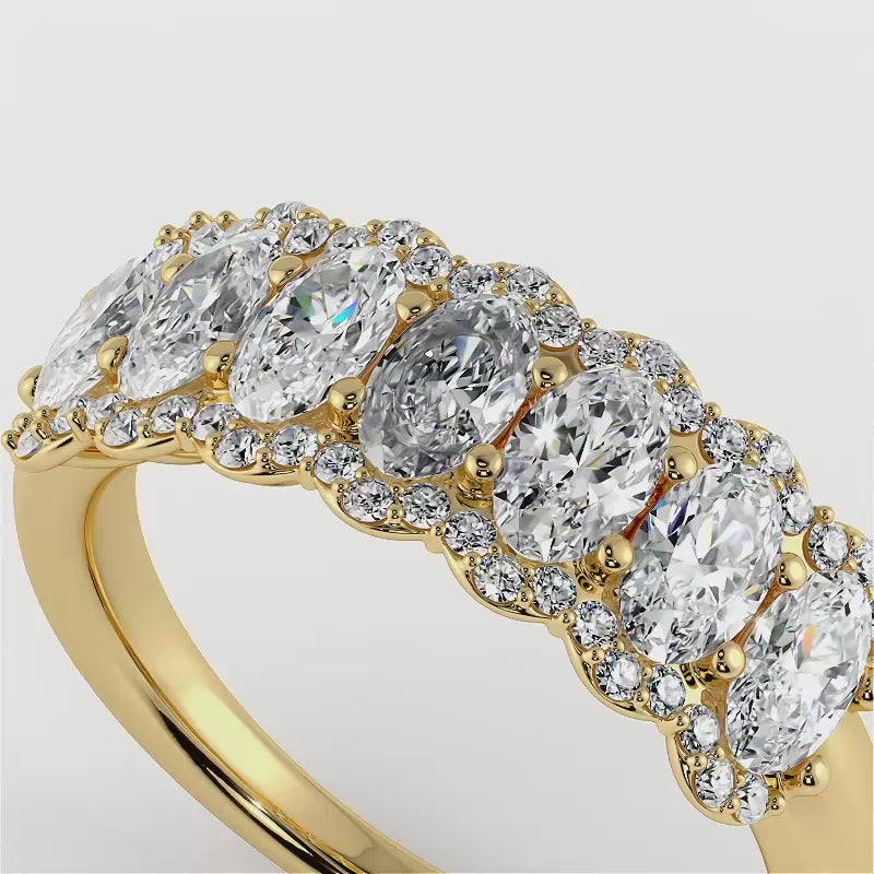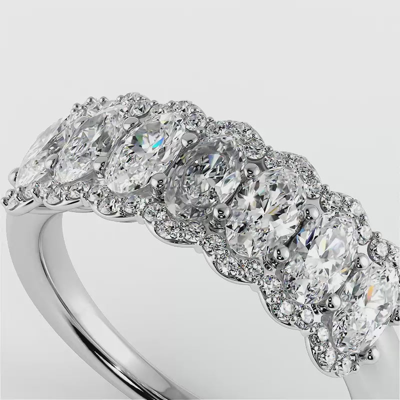 This beautiful anniversary ring features 7 oval shape diamonds surrounded by smaller brilliant cut round diamonds.