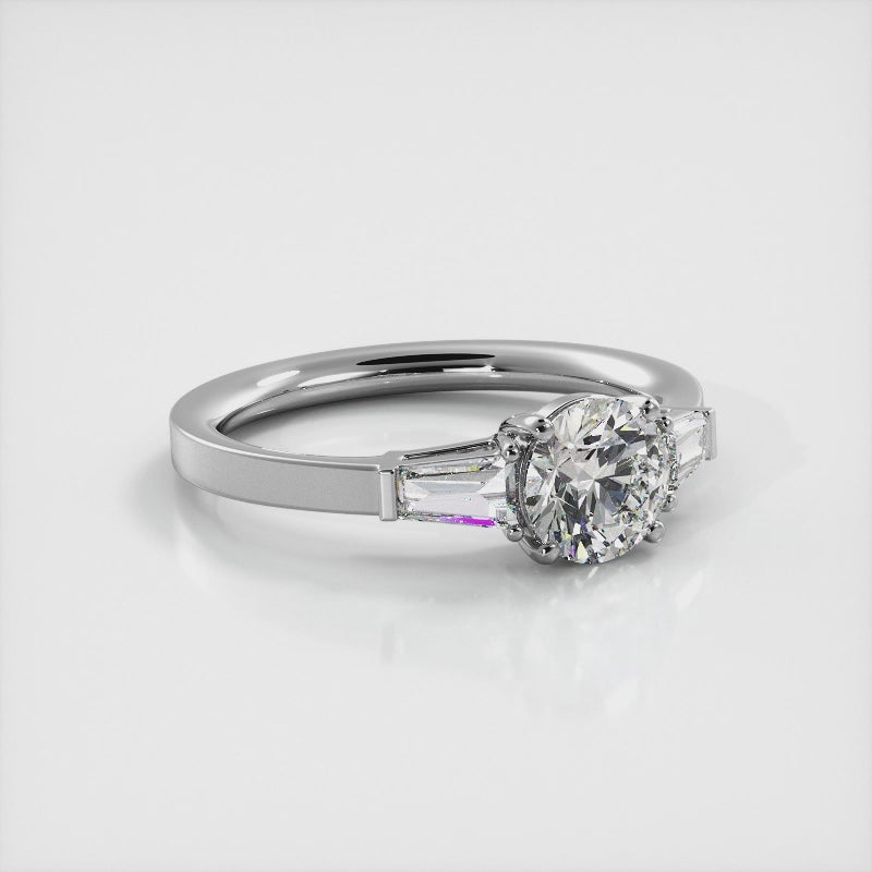 This classic three stone diamond engagement ring features 2 baguette side diamonds and one round brilliant cut center diamond. Customize this ring in gold or platinum.
