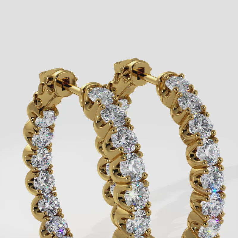 The diamonds in these stunning diamond hoop earrings are set in a U shape 4 prong setting. The effect is spectacular as the front and sides of the diamonds are visible.