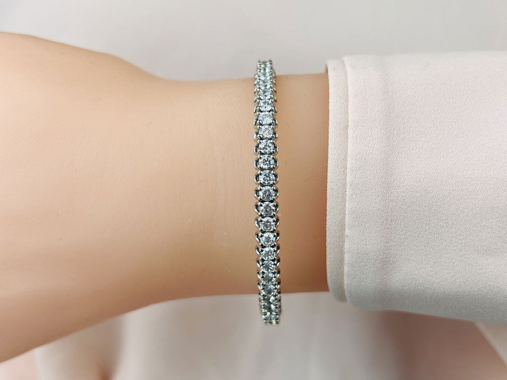 A touch of glistening sparkle sits atop this diamond bangle bracelet. The modern setting features .u. shaped designed prongs which hold brilliant round diamonds in a selection of three varied sizes. It is a unique bracelet to showcase your signature style. Our bangles are 7. in length.